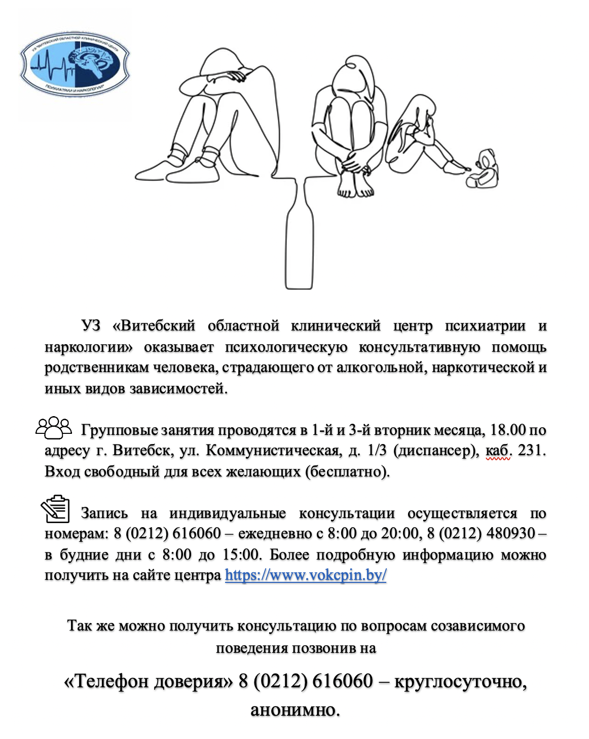 Круглосуточно психологическую поддержку и помощь можно получить по телефону Доверие УЗ «Витебский областной клинический центр психиатрии и наркологии» 8 (0212) 61-60-60.